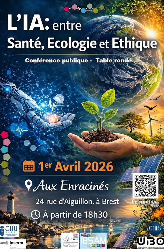 En collaboration avec l'IBSAM (Institut Brestois Santé Agro Matière), des présentations suivies d'une table ronde pour décrypter les enjeux de l'intelligence artificielle. rejoignez-nous le 1er avril 2026 au café Enracinés à partir de 18h30 !